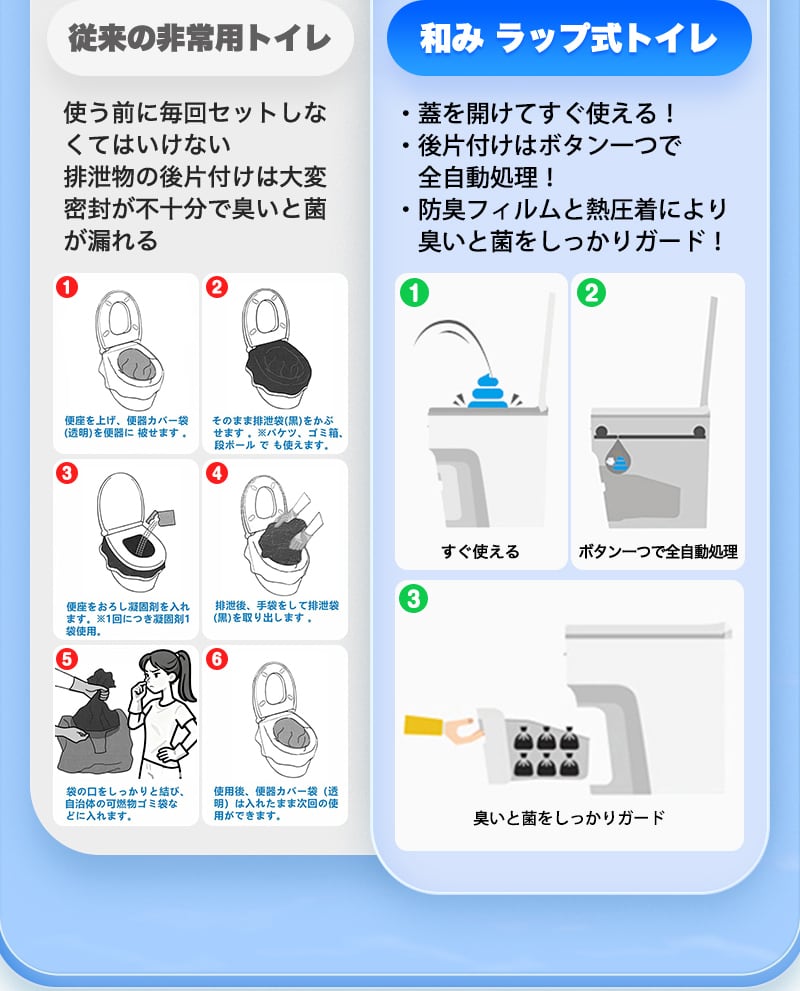 ■和みについて 無水・ラップ式簡易トイレ「和み」は、水なしで使えるポータブルトイレ。使用後はボタン操作で自動密封し、防臭フィルムでニオイをしっかり抑えます。「臭いが残る」「処理が不安」…その悩みを減らし、安心して使える“衛生的な仕組み”をご提供します。