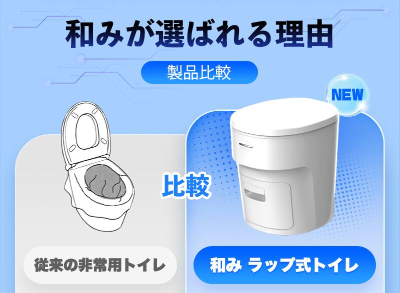 ■和みについて 無水・ラップ式簡易トイレ「和み」は、水なしで使えるポータブルトイレ。使用後はボタン操作で自動密封し、防臭フィルムでニオイをしっかり抑えます。「臭いが残る」「処理が不安」…その悩みを減らし、安心して使える“衛生的な仕組み”をご提供します。
