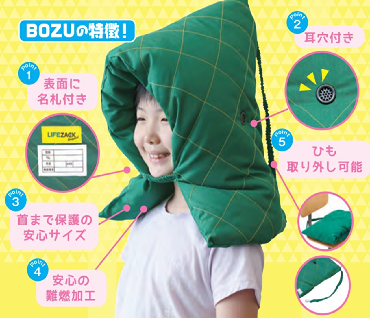 被った時の左側には笛(サイコール)を、また右側には避難時に必要になるマスクを収納するスペースが付いています。