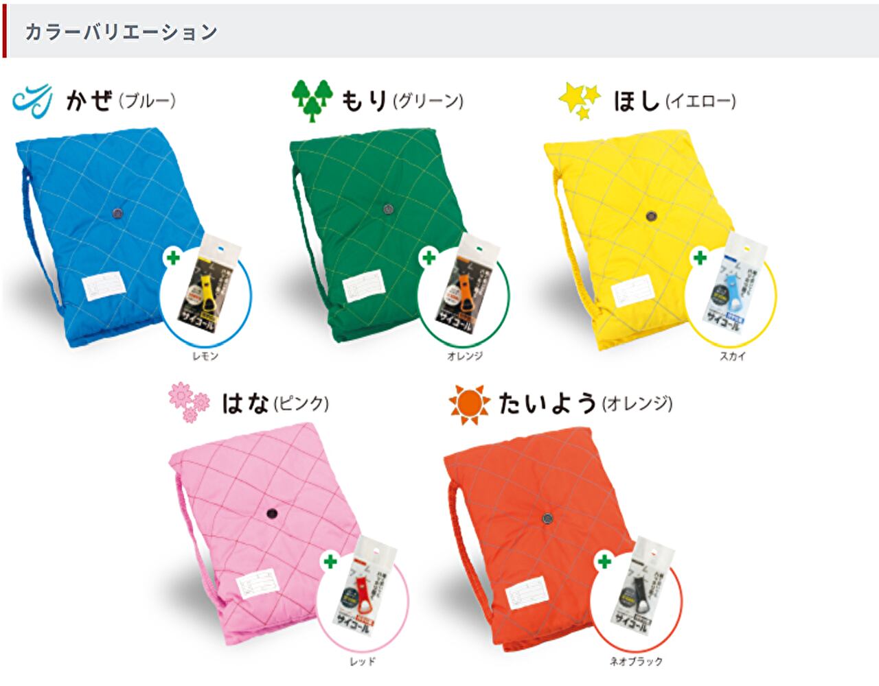 カラフルな6色の防災ずきん。色に合わせたおしゃれなステッチ!