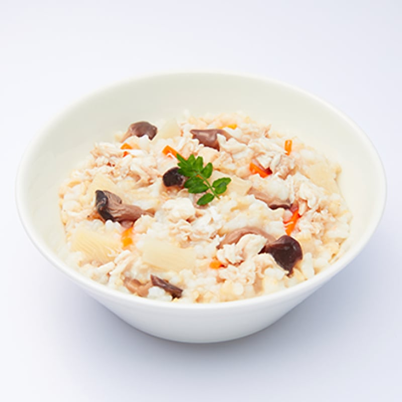 ・国産発芽米に真鯛フレークと野菜、きのこを加え鯛出汁、謹製昆布エキス、魚醤等の旨味を活かした和風ごはんです。