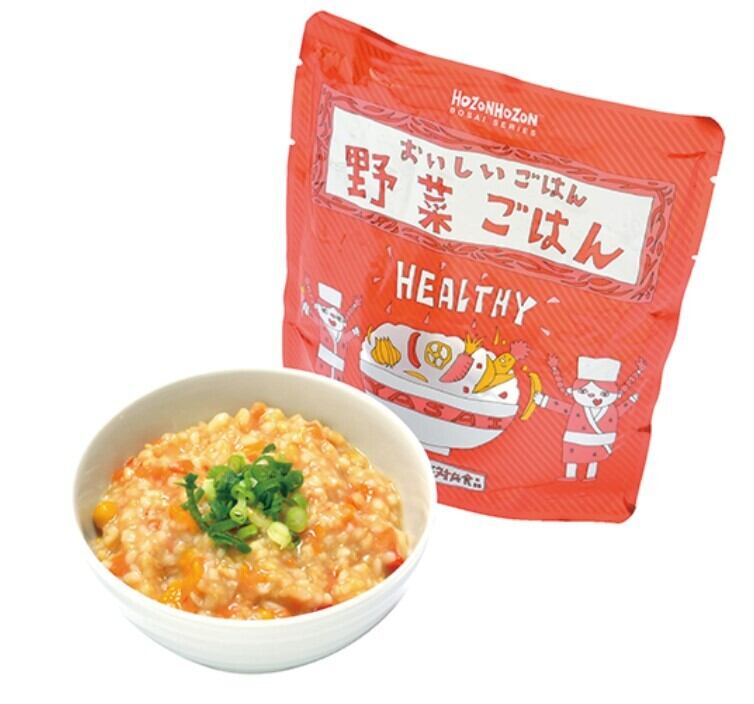 ・国産発芽玄米に野菜(人参、黄ピーマン、赤ピーマン、たまねぎ、とうもろこし)を加え自社謹製昆布エキス、ホタテブイヨン等の旨味を活かし美味しさを追求した野菜ごはんです。